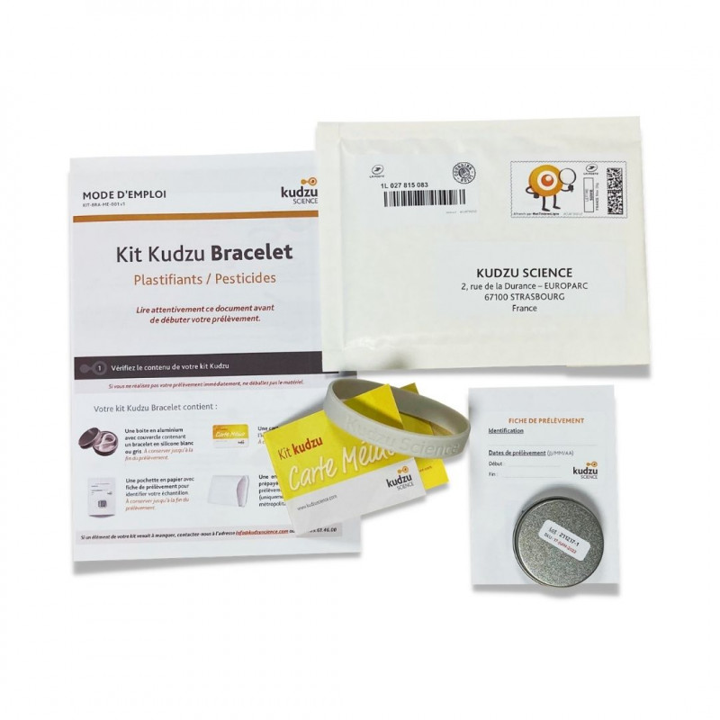 Ce kit d’analyse permet de mesurer votre exposition à 12 plastifiants et 8 pesticides. Le dispositif de prélèvement sur bracelet est très simple : après avoir porté le bracelet en continu pendant 7 jours, et l'avoir retourné à Kudzu Science, celui-ci est analysé en laboratoire pour identifier et quantifier les polluants qui y sont présents. En l’absence de valeurs guides, les résultats sont comparés aux données statistiques établies par le laboratoire.